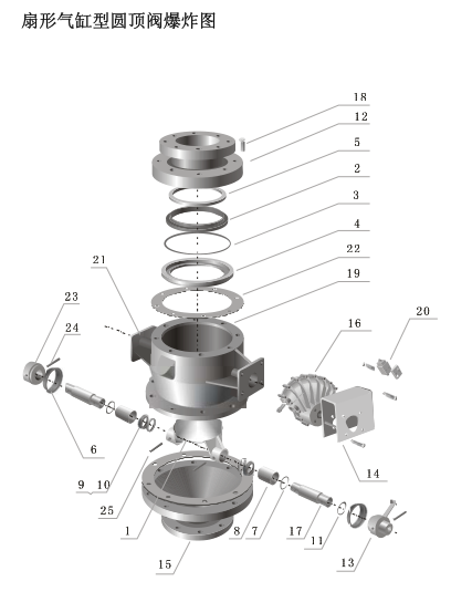 5. 如果扇形氣缸型圓頂閥水平安裝,必須保證圓頂閥在開啟狀態(tài)時(shí),圓頂(件 1)處于閥的上半部。